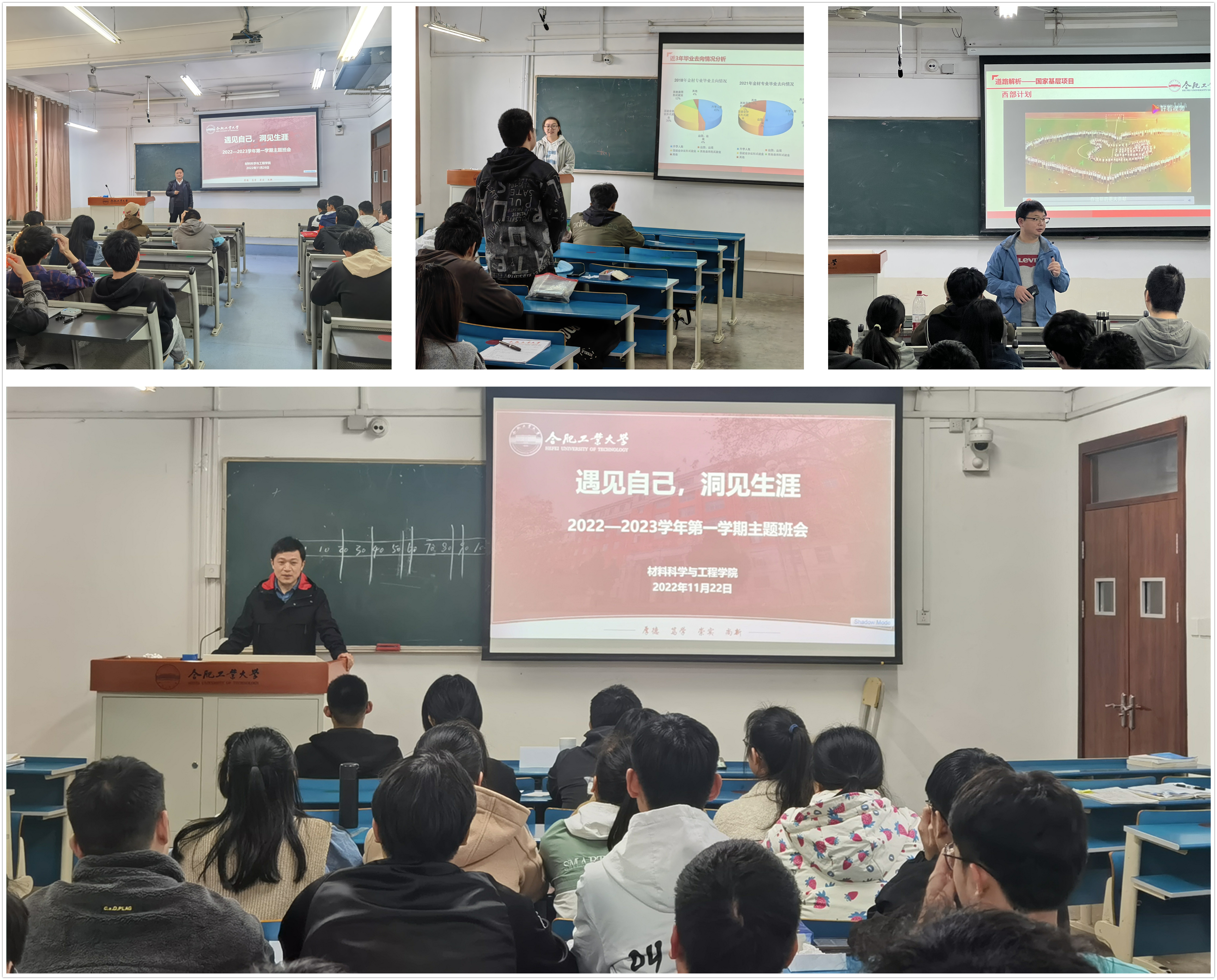 本次主题班会是材料学院推进“全程融通”一体化育人体系的重要举措,学院通过开展职业测评、一对一个体咨询、团体辅导等,鼓励学生在主动开展自我探索和职业探索,找准生涯发展定位。学院还将进一步强化对学生生涯规划教育和就业指导,激发学生生涯发展自主意识,引导学生树立正确的成才观,砥砺立志成才的青春本色。