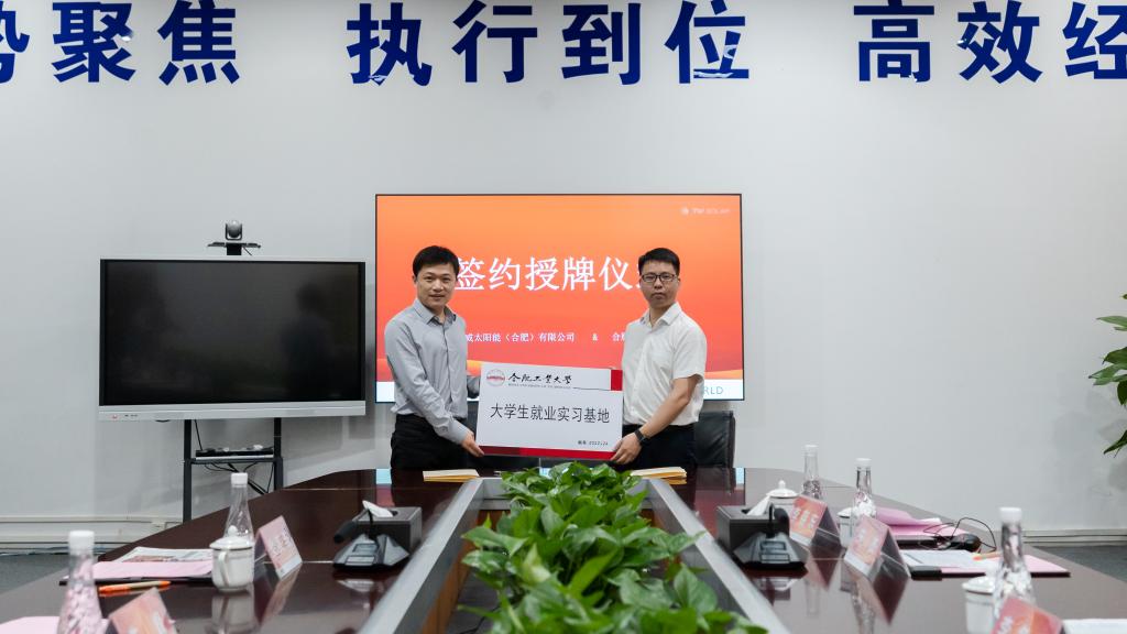 双方代表举办通威太阳能(合肥)有限公司与太阳成集团大学生就业实习基地签约暨揭牌仪式,签署《共建太阳成集团大学生就业实习基地协议书》,并为基地揭牌,与会成员共同参观并就求职和发展进行深入交流。