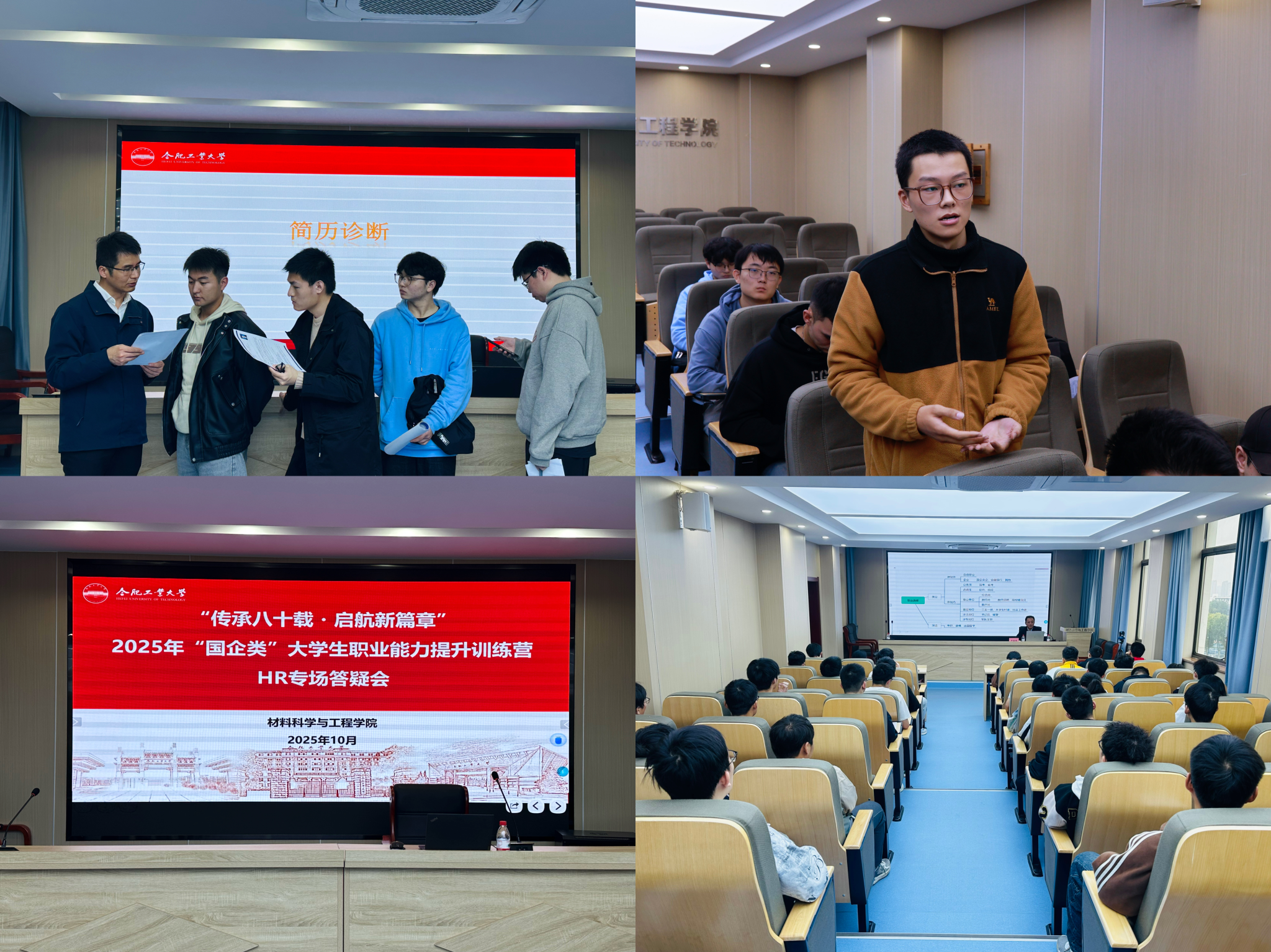 在简历制作与笔试备考工作坊中,主讲老师系统讲解了简历撰写要点与笔试策略。面试技巧报告会上,主讲老师围绕国企面试特点,深入解析了自我介绍与不同类别面试的形式解读与应对技巧。训练营还特邀来自知名企业人力资源部门的招聘负责人主持了HR专场答疑会,从企业招聘视角解答求职困惑,并就职业选择、人岗匹配等话题与学员深入交流;活动现场,嘉宾还对学生的简历进行了现场审阅和点评,并提出了具体修改建议。此外,学员们走进长安合肥公司开展企业参观,通过实地了解生产流程与企业文化,对国企运营模式和人才需求有了更直观的认识,进一步明确了职业发展方向。